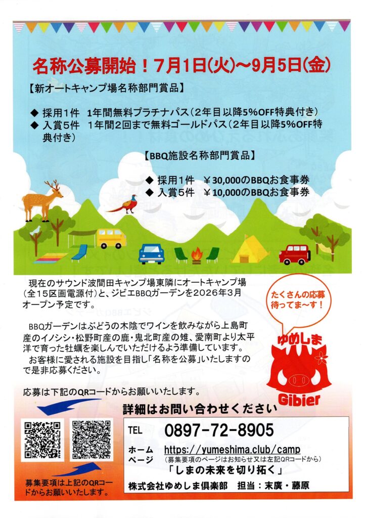 新アウトドア施設名称公募本日9月5日公募締め切りです!!