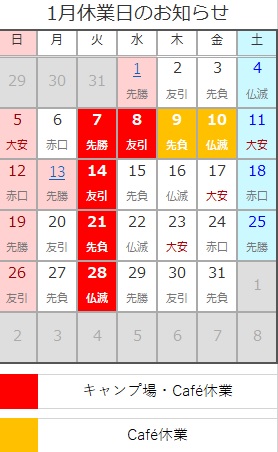 1月は7日14日21日28日が定休日、8日が臨時休業、9日10日がCafe休業となります。