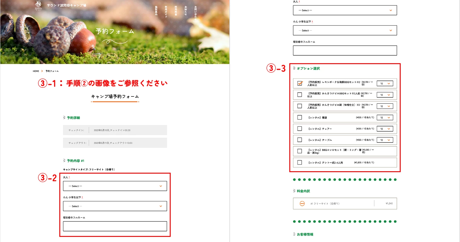 また、オプションとしてBBQセットやジビエ鍋などの予約販売品、テント、寝袋等のレンタル品をご用意しております。ご希望の方はチェックを入れ、個数をご入力ください(③-3)。